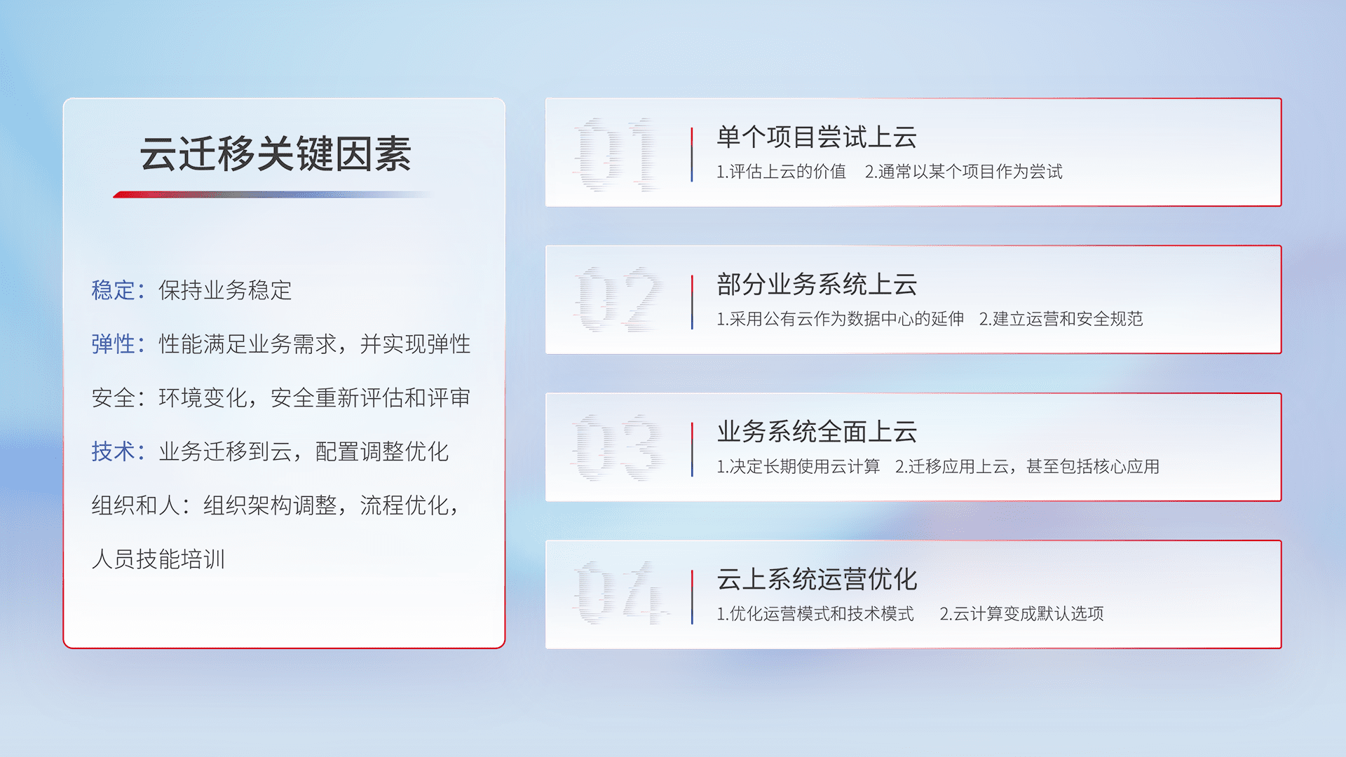 结合实际业务,,,从规划设计、、云平台选型、、、、云原生改造、、、数据迁移、、、、集成交付,,迁移全过程为客户识别最佳上云路径,,,,做好风险识别管理,,,,设计网络架构、、、身份权限、、安全审计合规、、操作审计、、、日志审计、、、、监控告警策略、、多站点容灾设计等,,,,对云上基础设施进行整体规划,,提升IT治理水平,,以满足弹性、、、、高可用、、高性能的需求。。。。