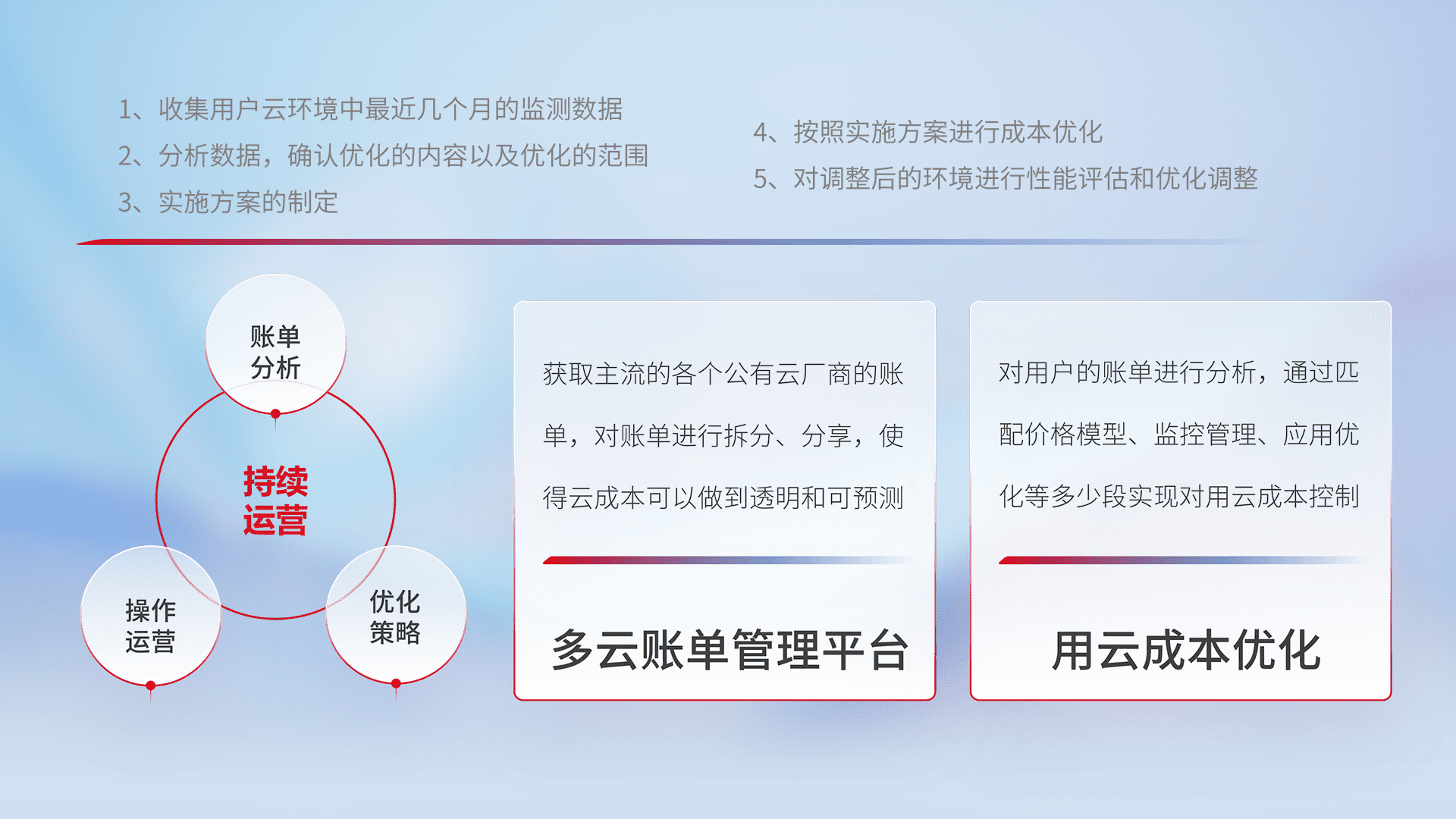 通过多云纳管,,,,以统一的资源数据模型把客户的云资源进行抽象和封装,,进而实现对多云资源的统一操作,,保障云资源管理的可靠性、、稳定性与可用性。。。量身定制化运维内容,,,,配置、、、、开发运维、、补丁管理、、备份、、监控、、认证和访问管理、、、、审计和日常巡检等,,,,保障在用云过程中的可靠度,,稳定度以及高可用率。。